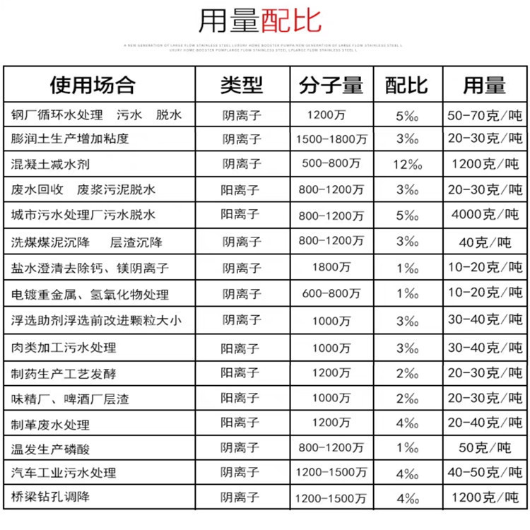 ÎÛË®´¦ÀíÖо­³£Óõ½¾Û±ûÏ©õ£°·ºÍ¾ÛºÏÂÈ»¯ÂÁ£¬¸ù¾ÝË®ÖʵIJ»Í¬ºÍÐͺŵIJ»Í¬£¬ÓÃÁ¿Ò²²»Ò»Ñù£¬ÓÉÓÚ½øË®Ë®Öʵĸ´ÔÓÐÔ£¬Ò»°ãÀ´½²ºÜÄÑÈ·¶¨¾Û±ûÏ©õ£°·µÄÓÃÁ¿¡£µ«ÊÇÎÒÃÇÔÚʹÓþ۱ûÏ©õ£°·±ØÐëÒª¸ù¾Ý¾Û±ûÏ©õ£°·Éú²ú³§¼ÒÌṩµÄÈܽâ±ÈÀý£¨0.1-0.5%£©À´½øÐÐÈܽ⣬ÖÁÓÚ¾ßÌåÔÚ´¦ÀíÎÛË®ÖеÄÌí¼ÓÁ¿£¬»¹ÐèÒªÔÚͶ¼Ó´ó»õǰÏȽøÐÐС²âÀ´È·¶¨¾ßÌåµÄÓÃÁ¿£¬µ±È»Õâ¸öС²âµÄ·½·¨½ñÌì¾Í½Ì¸ø¸ø´ó¼Ò¡£